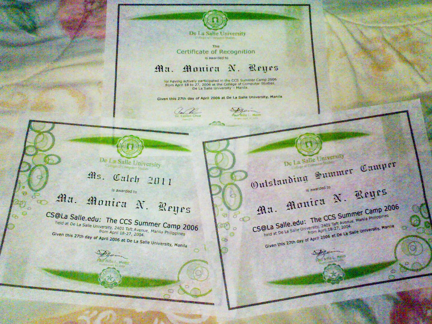 these are the three certificates i received from the summer camp. one of them is just a certificate of recognition, while the other two are real awards. i already mentioned the other one. the other one is the outstanding summer camper award. the campers didn't vote on this award. i think the facilitators did. thank you. it's basicaLLy seLf-expLantory. perks of this award: La Salle bag and they will contact me regarding my entry in DLSU. yey. :)