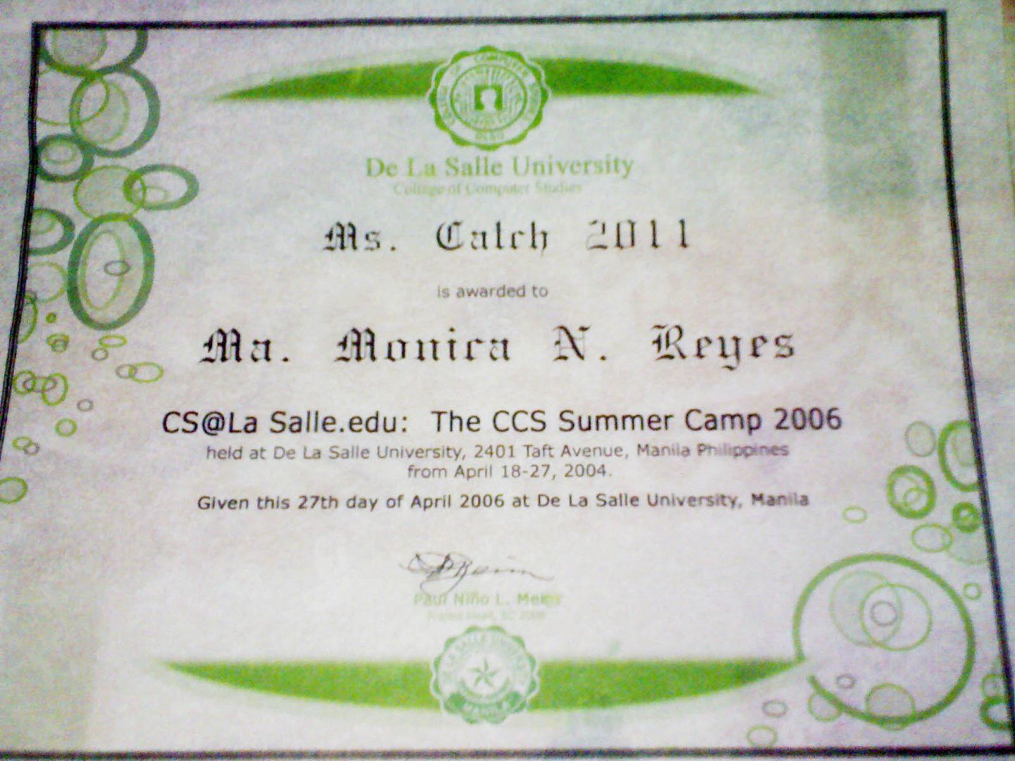 this was awarded to me during the summer camp. "ms. catch 2011" means that i am the person who is most likeLy to graduate from la salle. haha. how accurate. =)by the way, my feLLow campers voted for me...thanks u guys. =)